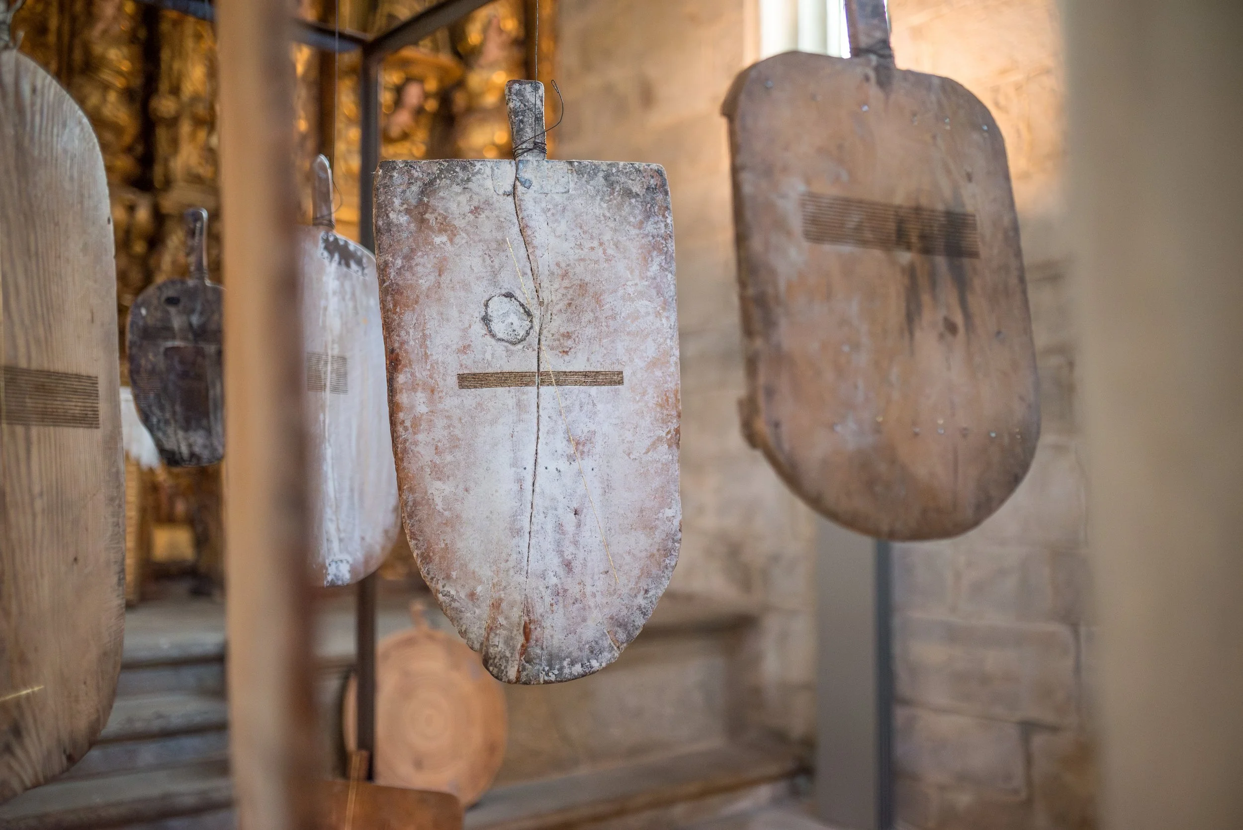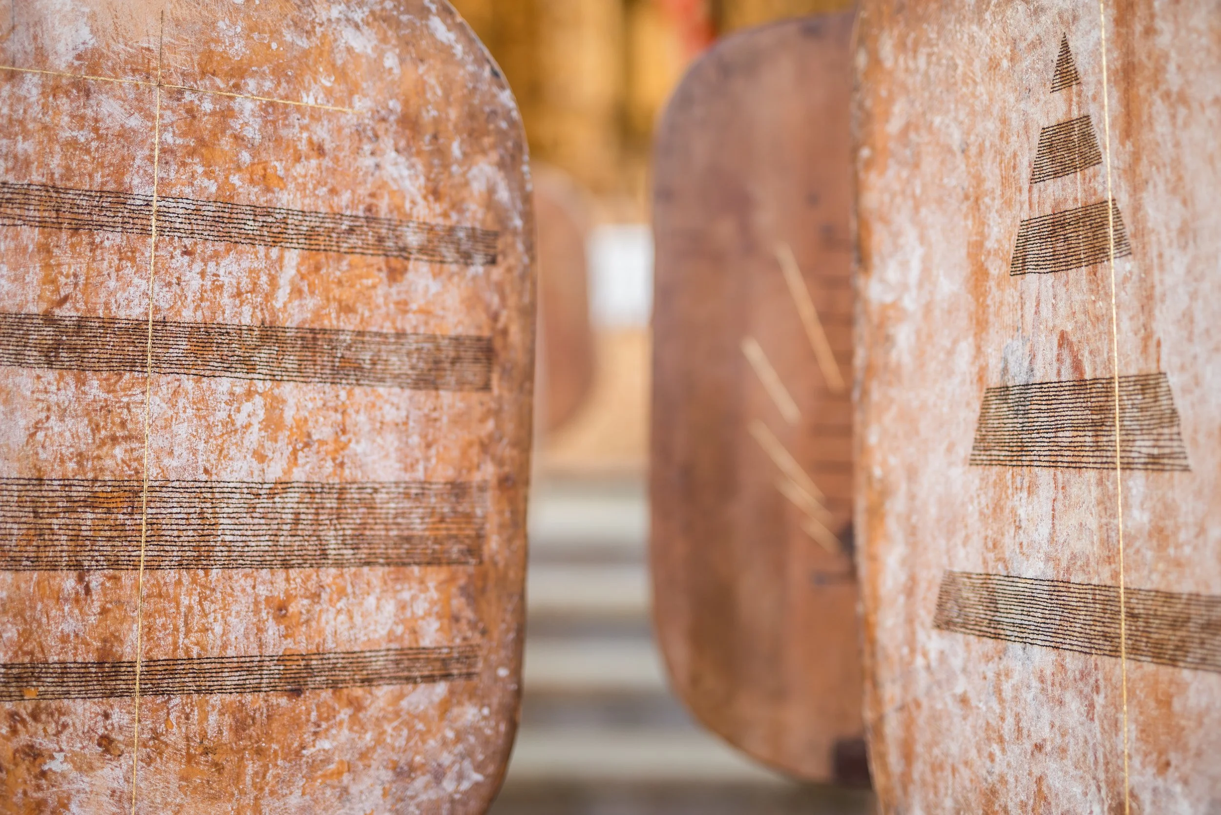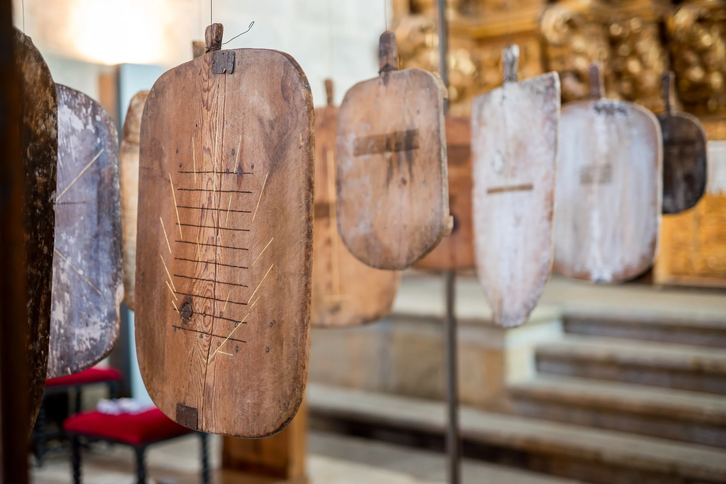 Originally baker’s boards, these wooden surfaces bear the marks of time — cuts, traces of dough, repairs, and signs of repeated use over the years. Upon them, lines were drawn with gold leaf and burned using sunlight concentrated through a magnifying glass. The number of burned lines on each board corresponds to the alphabetical position of the first letter of each character’s name in English. For example, “James” is represented by ten lines.