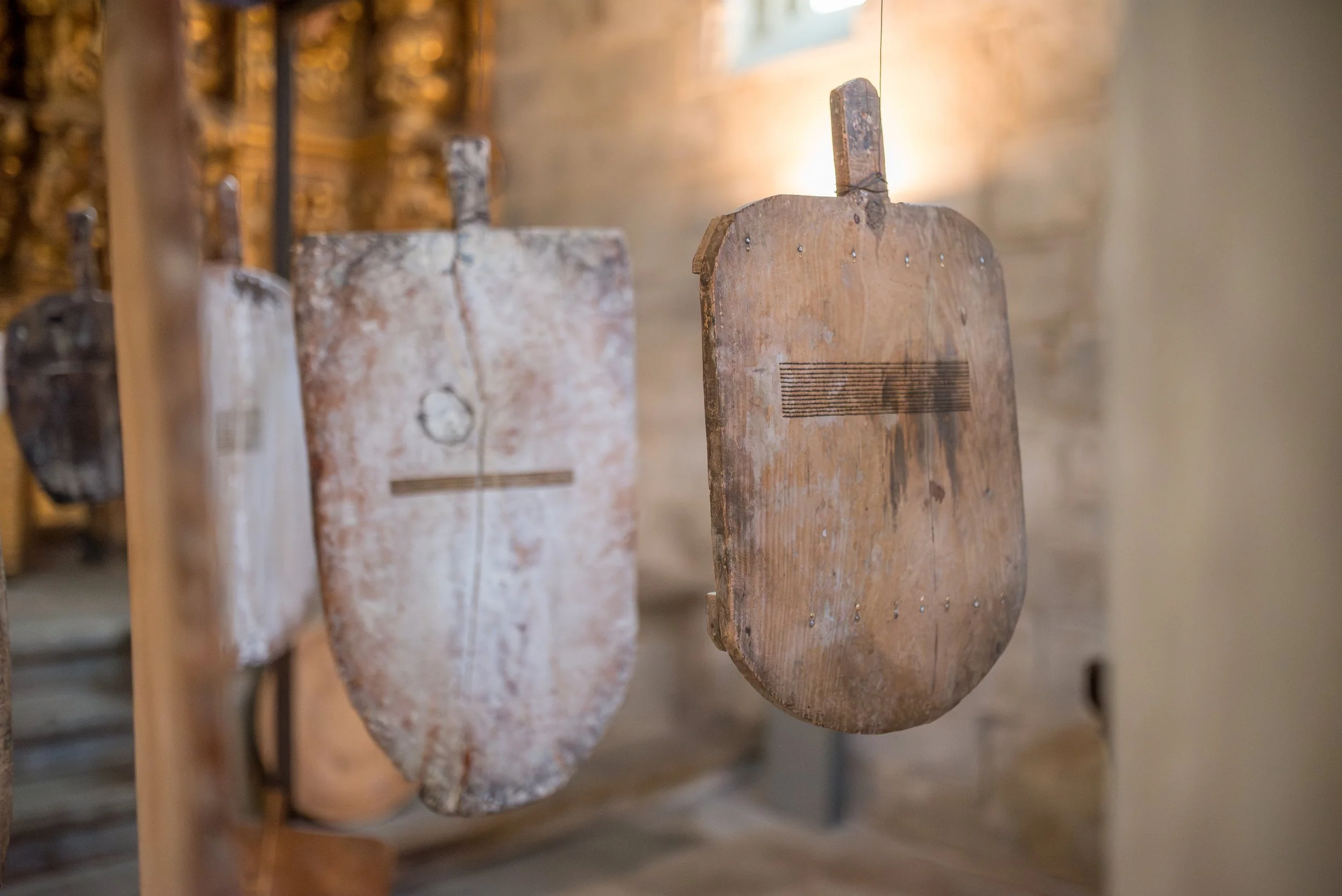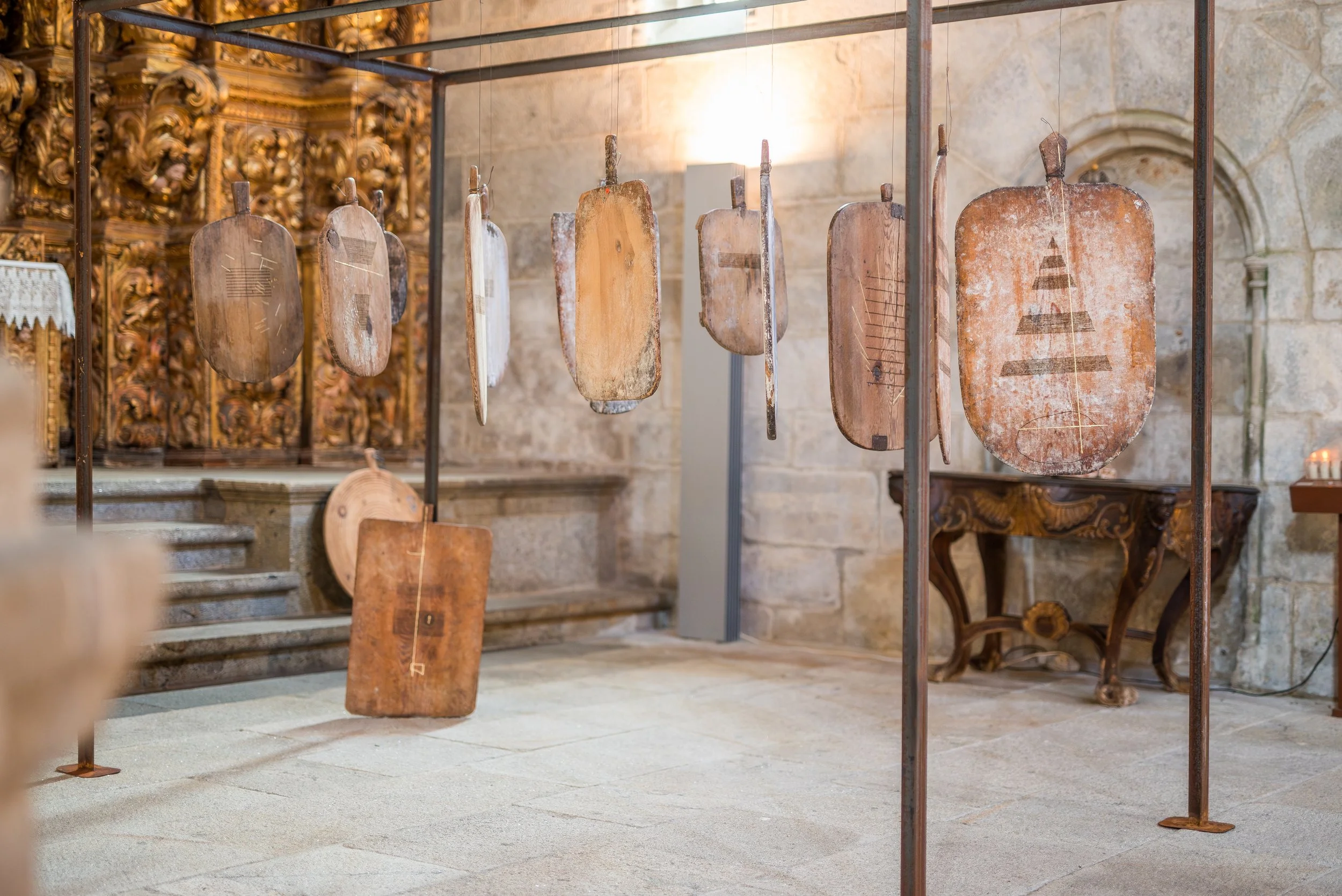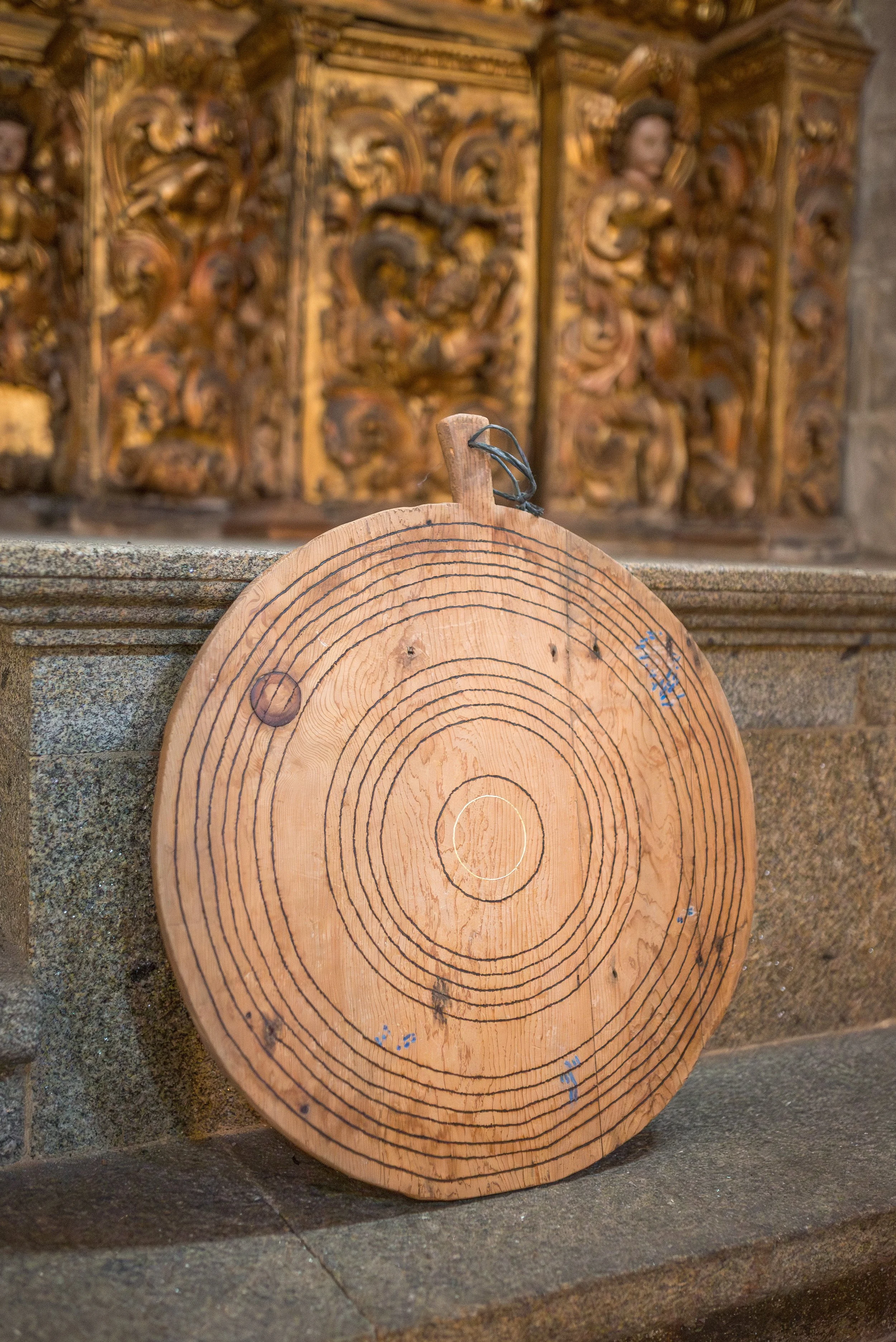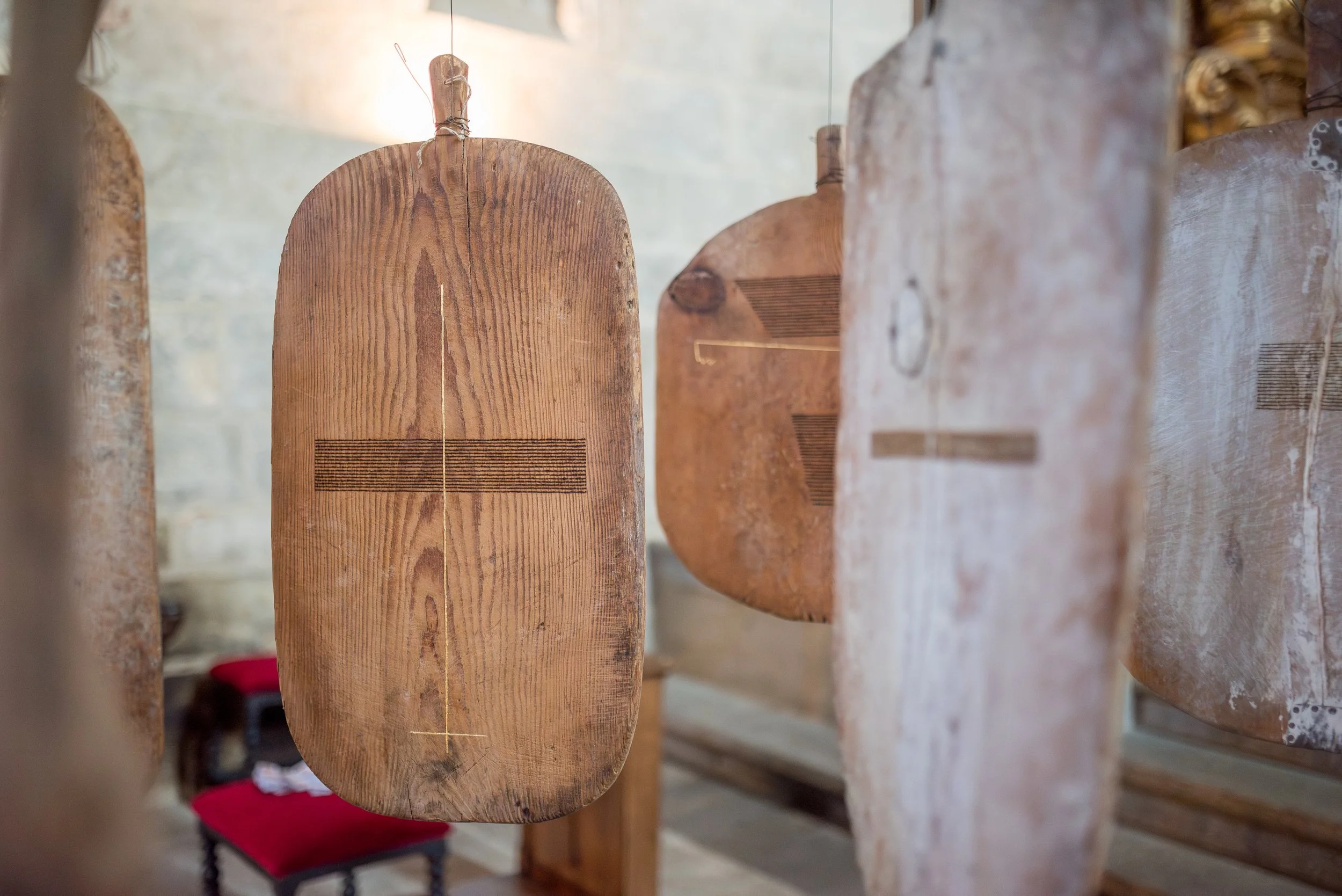 Originally baker’s boards, these wooden surfaces bear the marks of time — cuts, traces of dough, repairs, and signs of repeated use over the years. Upon them, lines were drawn with gold leaf and burned using sunlight concentrated through a magnifying glass. The number of burned lines on each board corresponds to the alphabetical position of the first letter of each character’s name in English. For example, “James” is represented by ten lines.